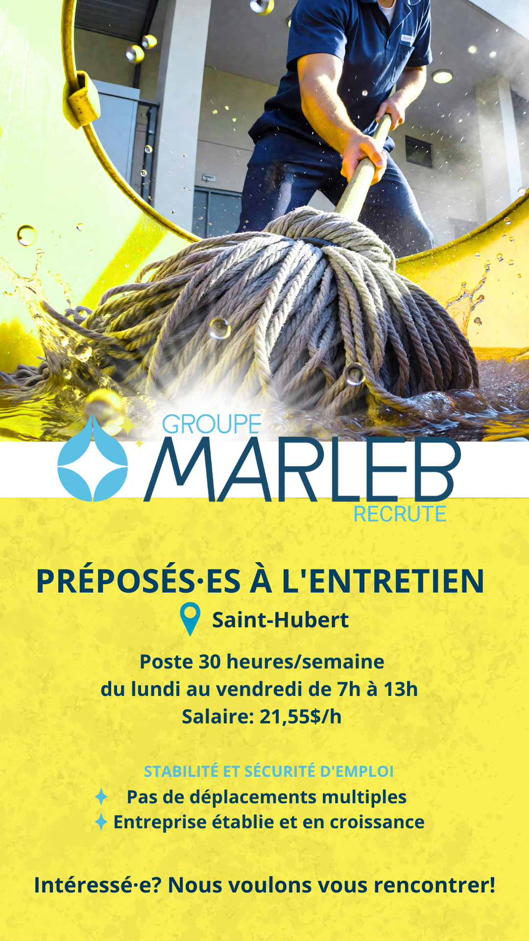 Le Groupe Marleb, entreprise québécoise établie offrant des services d'entretien professionnel, recherche Préposés.es à l'entretien pour rejoindre son équipe à Saint-Hubert.